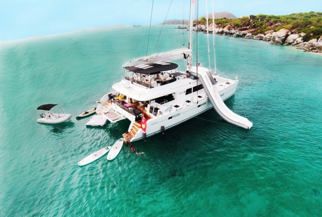This brand new sailing catarmaran, London Sky is not one to overlook! London Sky offers 62ft of luxurious living and relaxation areas. Perfect for any occasion, she is equipped with indoor & outdoor mood lighting and Bose surround sound. The vast variety of water sports is almost unbelievable, not only does London Sky have the basic toys, she also has a custom inflatable water slide, electric bikes and on-board full scuba diving. London sky has three handpicked crew members ready to show you and your friends & family a time to remember with a highly personalized vacation experience! A total of four queen sized guest cabins each with en-suite bathrooms. London Sky also has a luxurious main salon with two spacious sofas, aft dining deck & lounging area, top deck fly bridge lounge with private sunbathing area and additional large custom forward deck sunbathing area, so everyone can find their personal relaxation space!